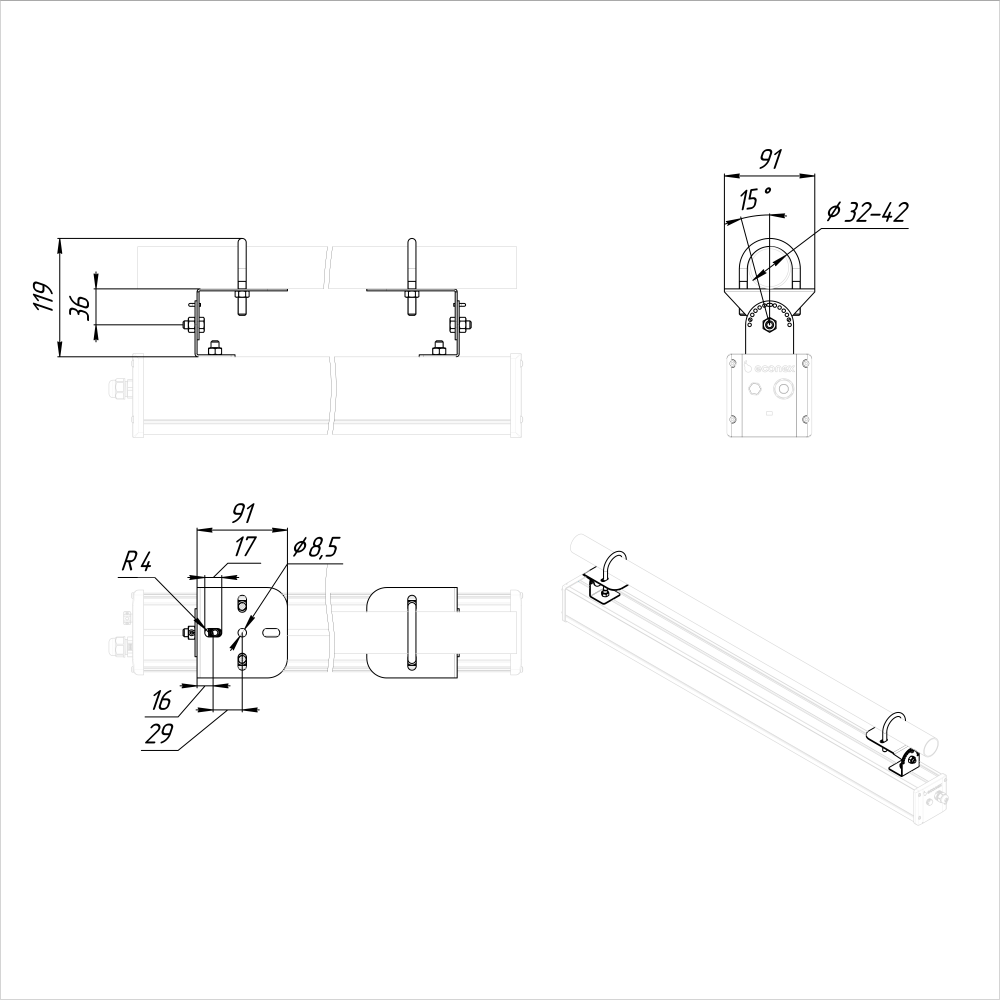 Крепление на трубу 40-50 мм для промышленных светильников с шагом фиксации 15°