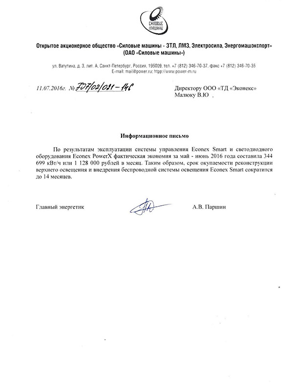 Комплексное решение по реконструкции системы освещения на предприятиях одной из ведущих энергомашиностроительных компаний «Силовые машины». АО «Силовые машины — ЗТЛ, ЛМЗ, Электросила, Энергомашэкспорт» специализируется на производстве турбин и другого вспомогательного оборудования для гидравлических, тепловых и атомных электростанций.