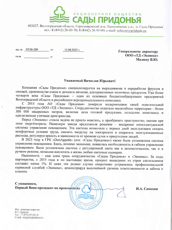 Модернизация системы освещения на заводе «Сады Придонья», Волгоградская область