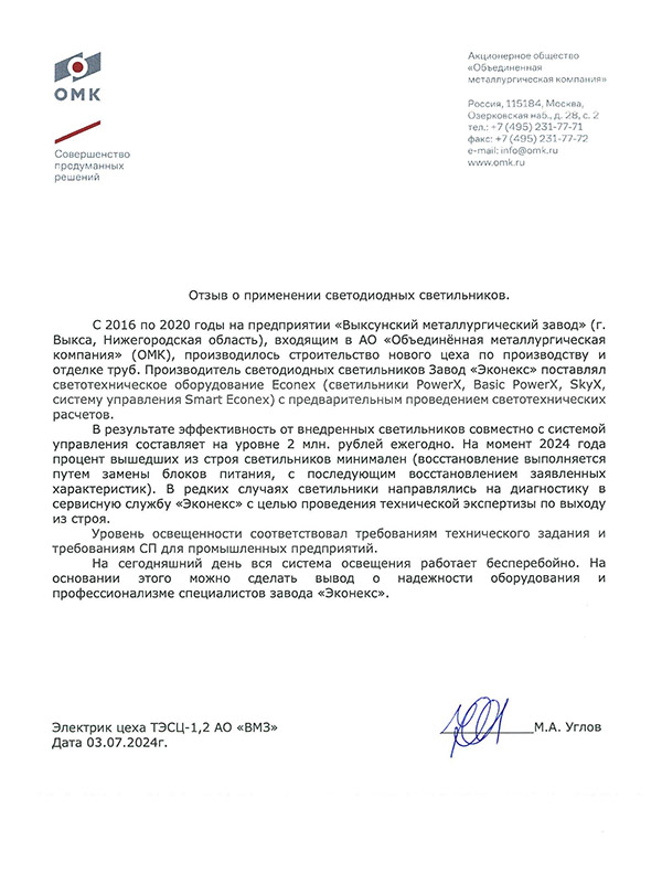 Модернизация освещения на предприятиях Объединенной Металлургической Компании, управление освещением