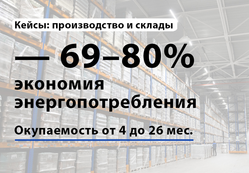 В этих кейсах замена ДРЛ/люминесцентных на LED + управление освещением может дать до ~80% экономии (в зависимости от режима/тарифа и сценариев управления).